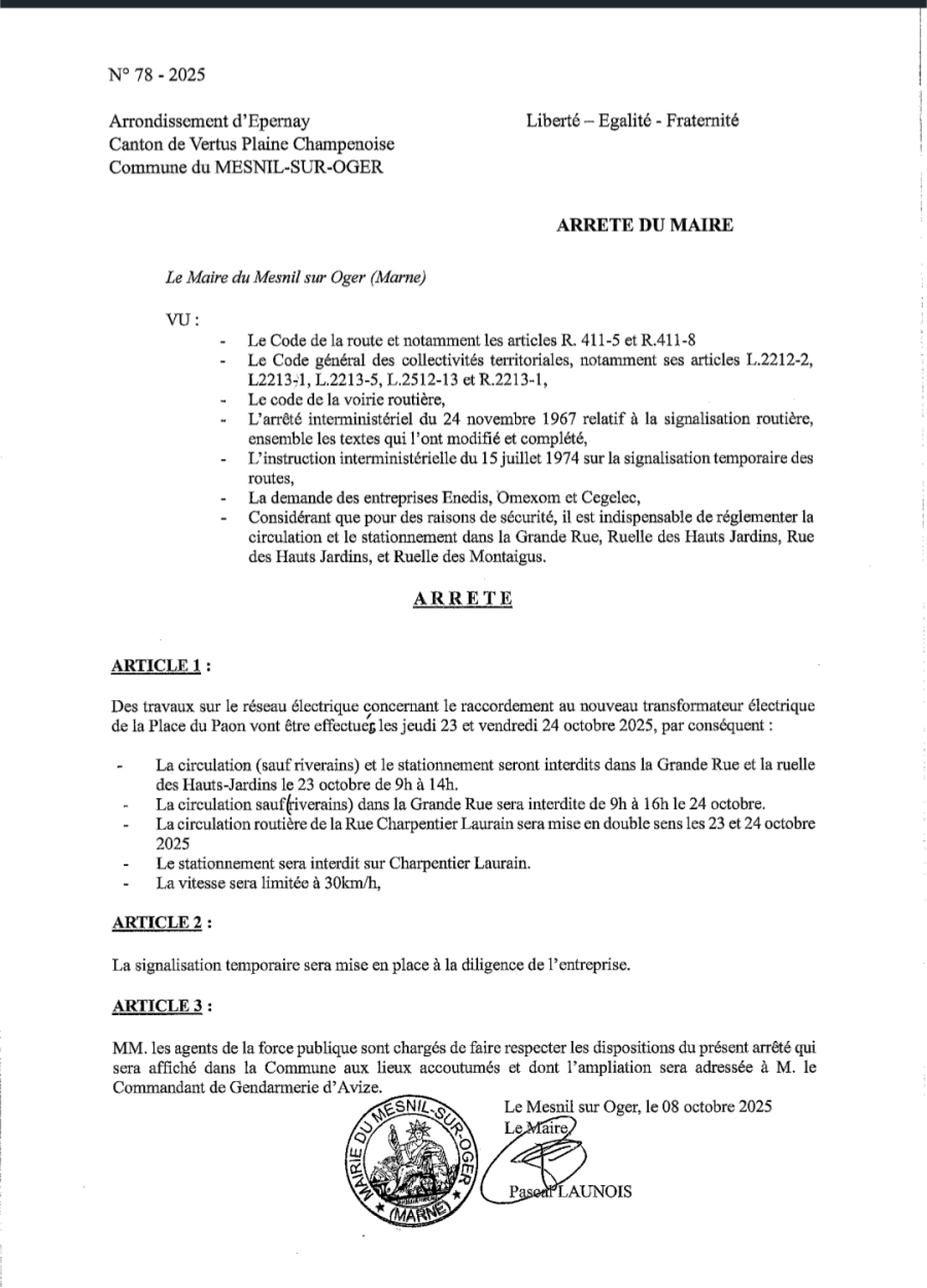 En raison de la bascule du réseau électrique du transformateur des Hauts-Jardins vers le nouveau situé Place du Paon, la circulation et le stationnement seront interdits dans la Grande rue et la ruelle des Hauts-Jardins le 23 octobre de 9h à 14h et le 24 octobre de 9h à 16h. La rue Charpentier-Laurain sera mise en double-sens et le stationnement interdit dans celle-ci.