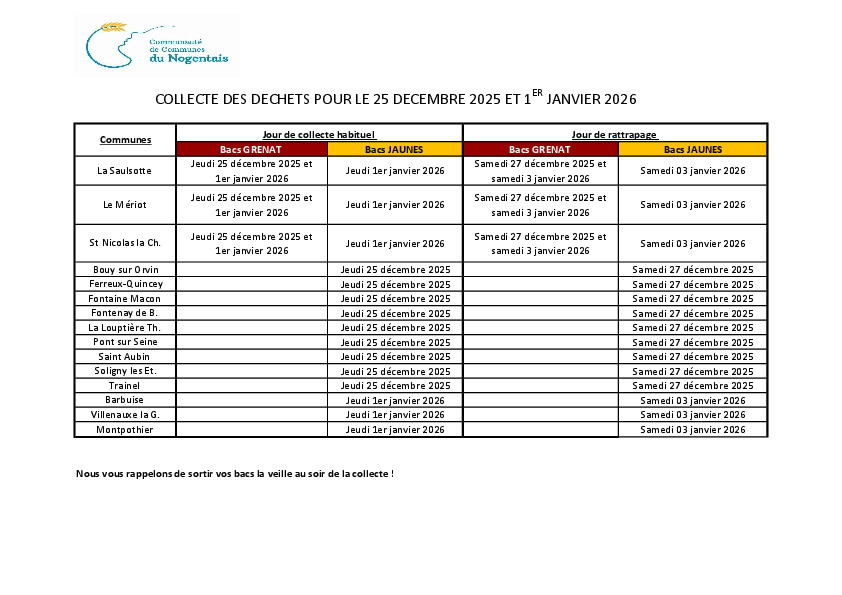 Calendrier de collecte des ordures ménagères pendant les fêtes de fin d'année