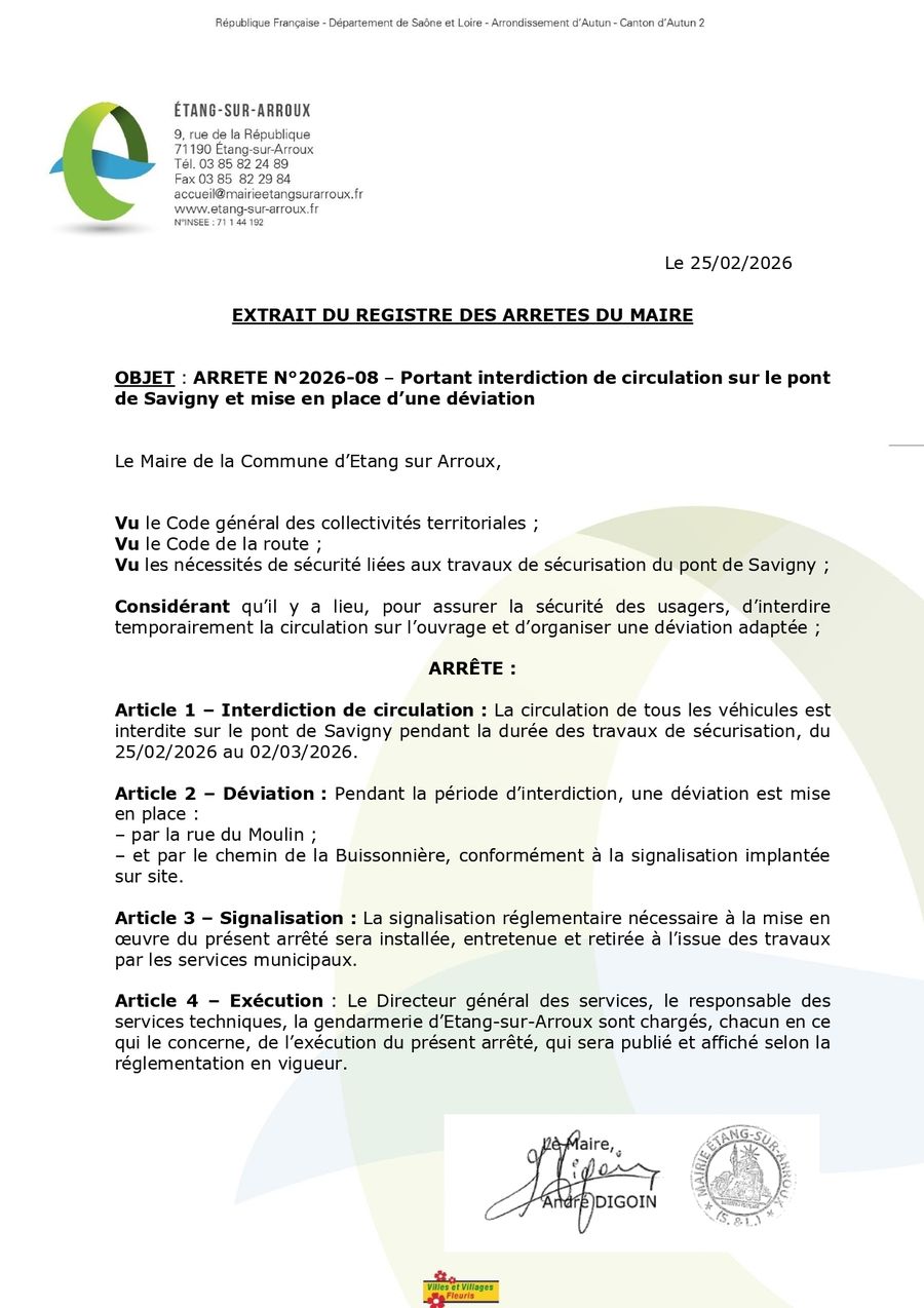 En raison de travaux de sécurisation, la circulation sera interdite sur le pont de Savigny du 25 février au 2 mars 2026 inclus.