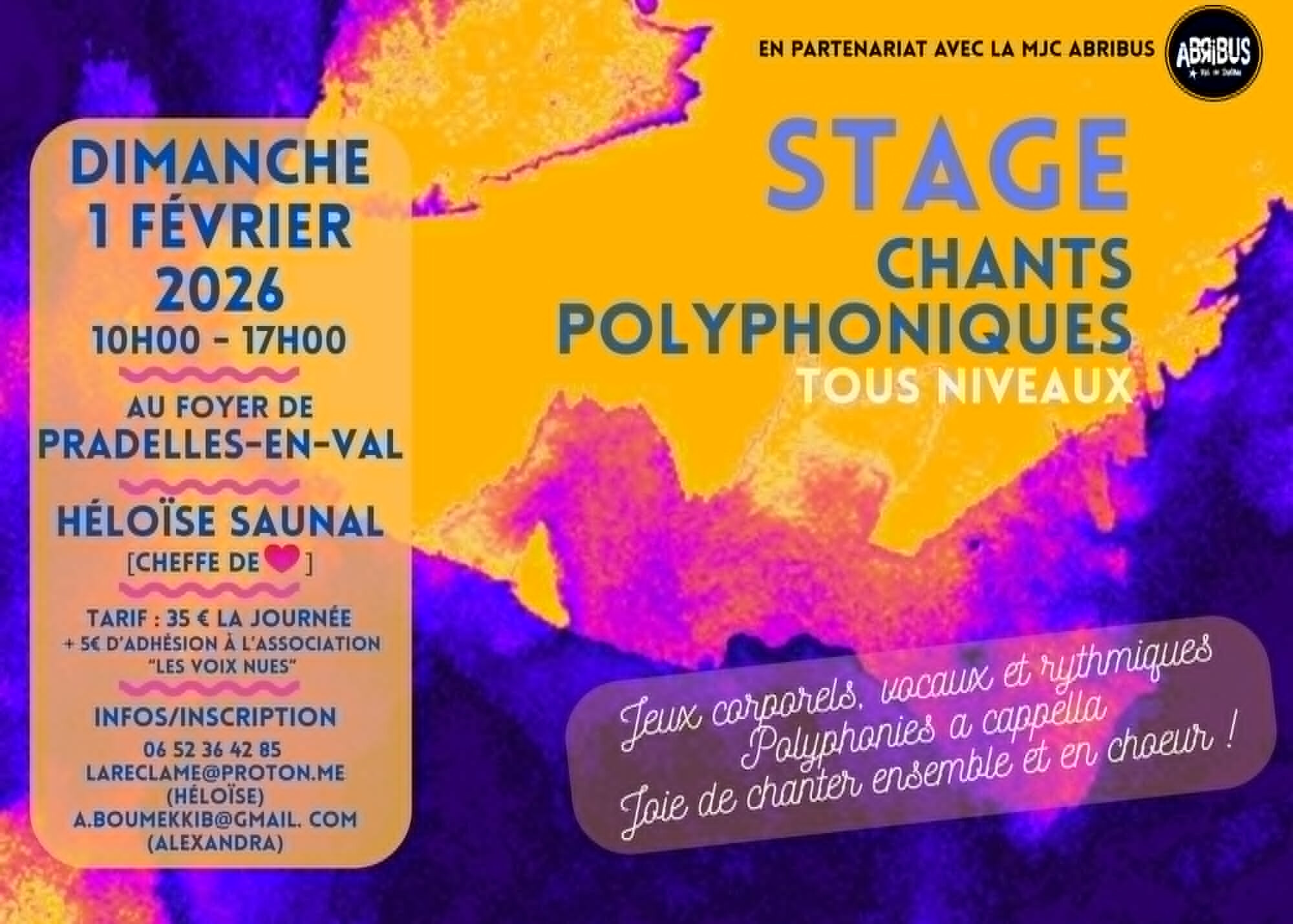 J'ai le plaisir d'organiser en partenariat avec la MJC Abribus, un stage de chants polyphoniques animé par la cheffe de chœur Héloïse Saunal.