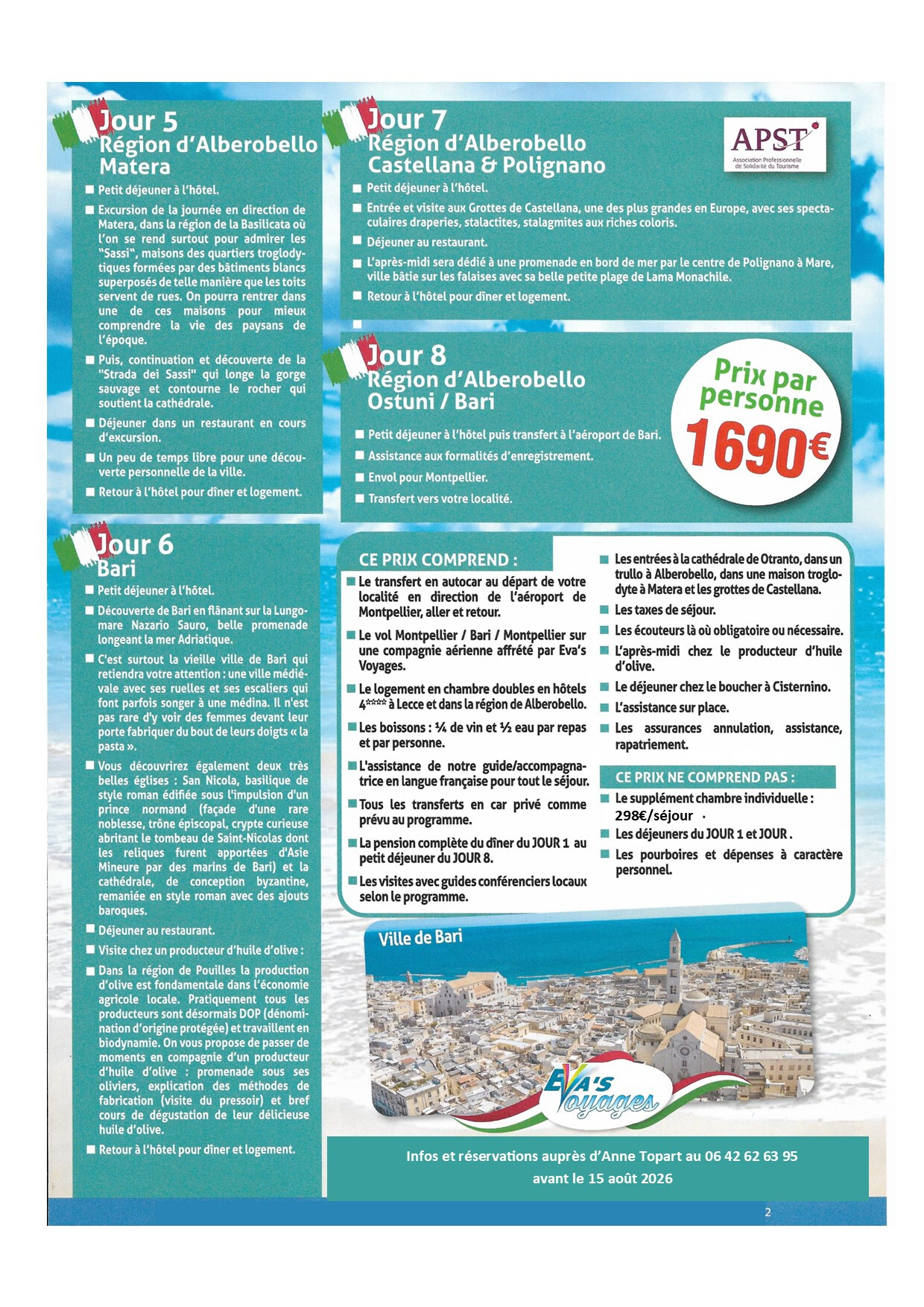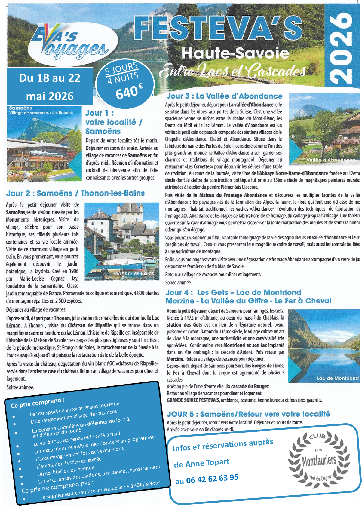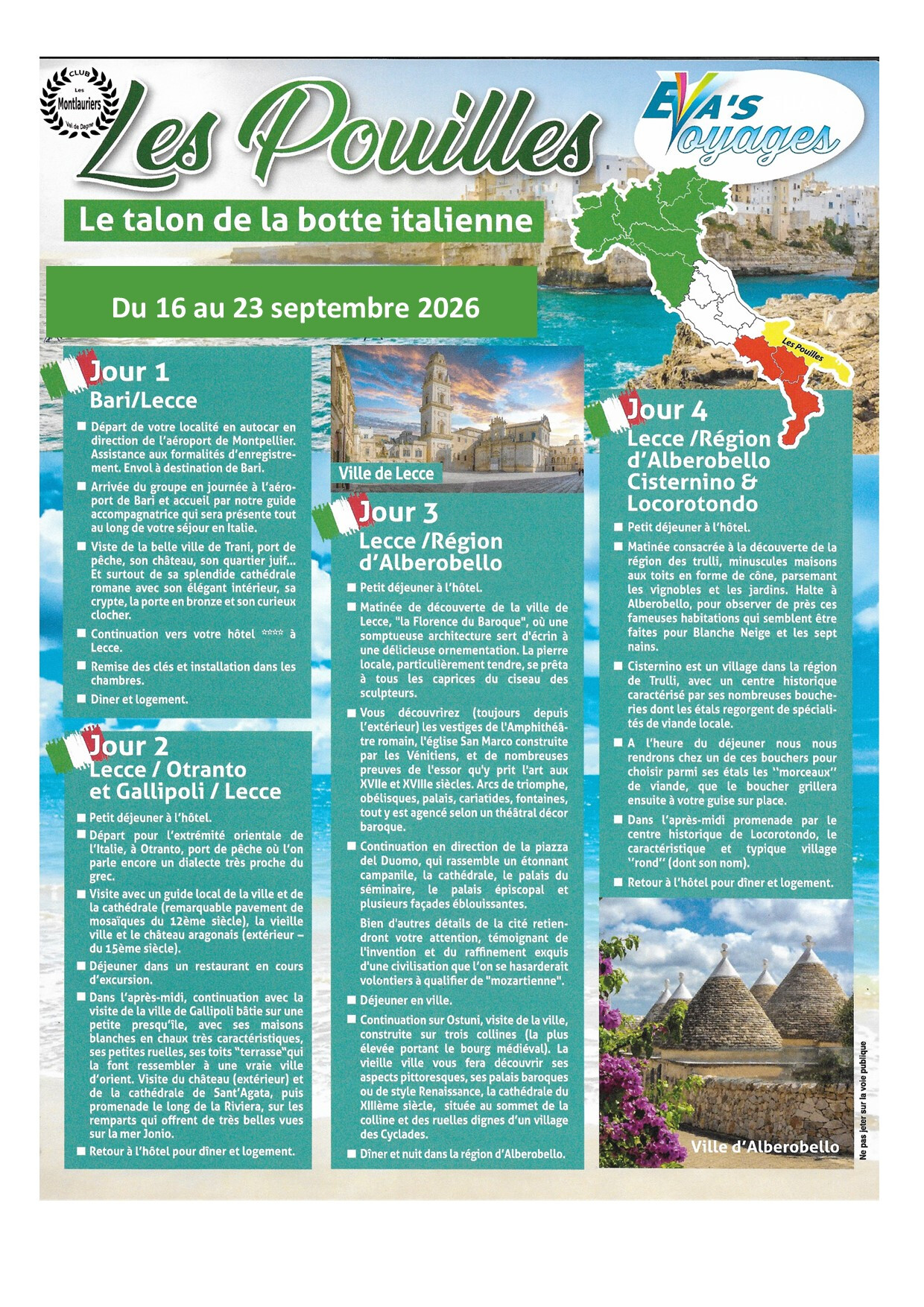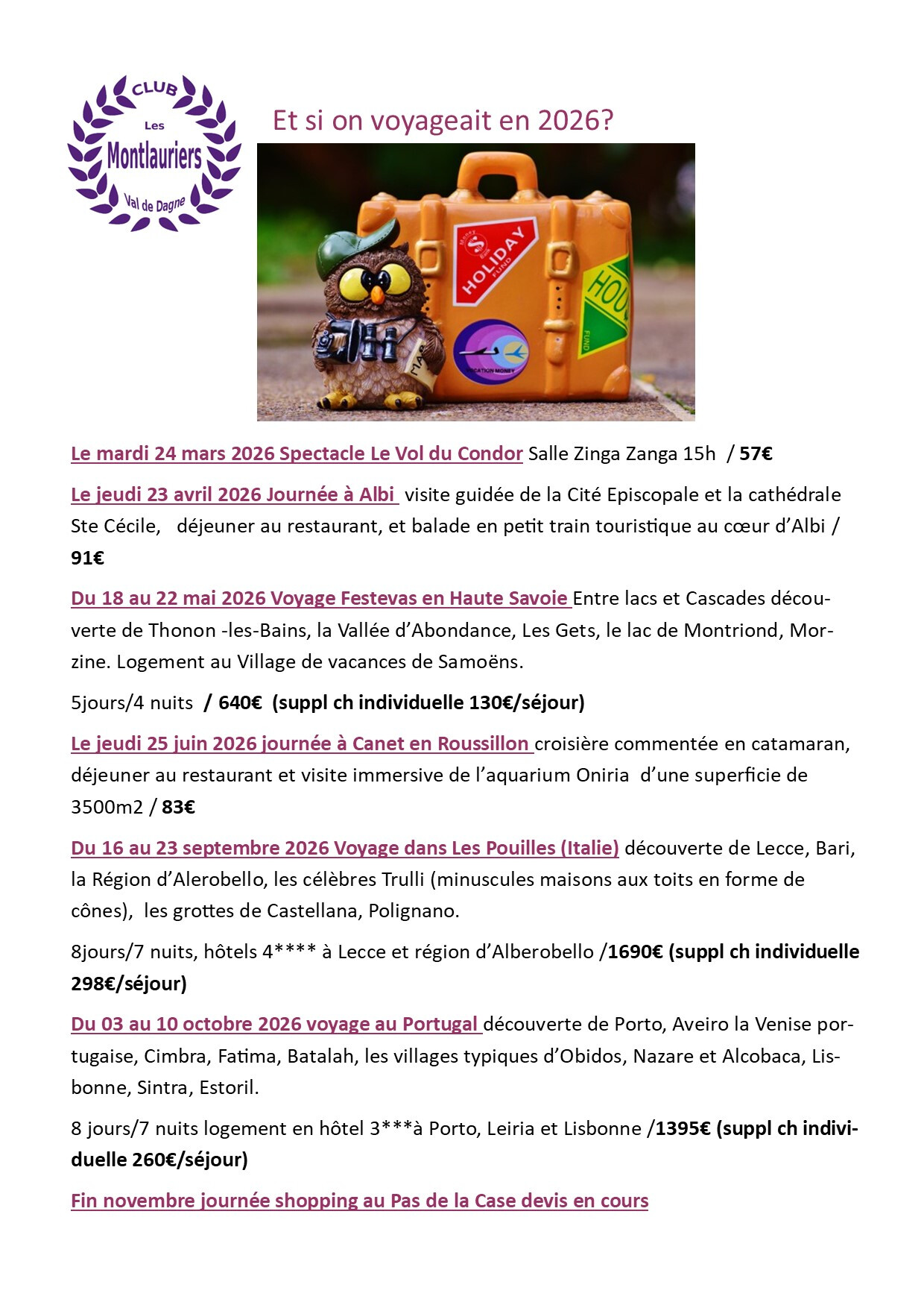 Ci-joint, le descriptif des 3 "grands" voyages à savoir les Festevas en haute Savoie, Les Pouilles en Italie et le Portugal.
