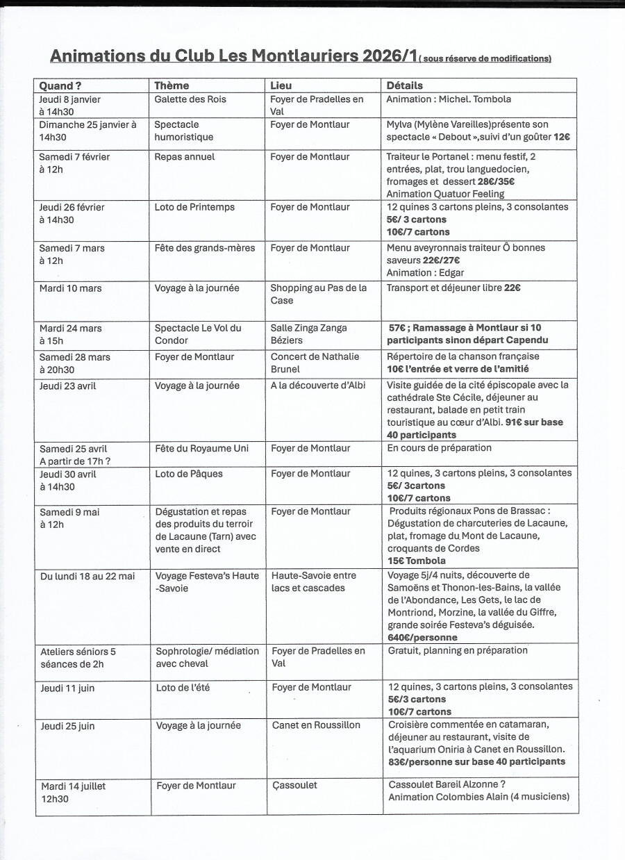 Vous avez reçu il y a peu de temps un récapitulatif des voyages proposés pour l'année 2026 en partenariat avec le Cap Seniors de Capendu.