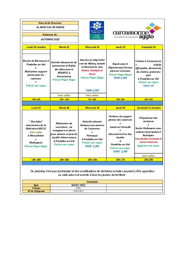 - Loisirs : Mercredi de 18h30 à 20h