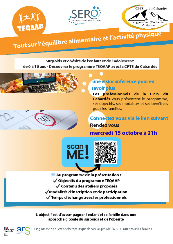 La CPTS du Cabardès, en partenariat avec la Structure d’Expertise Régionale Obésité (SERO Occitanie), lance une campagne d’information autour du programme TEQAAP (Tout sur l’Équilibre Alimentaire et l’Activité Physique), destiné aux enfants et adolescents de 6 à 16 ans en situation de surpoids ou d’obésité.