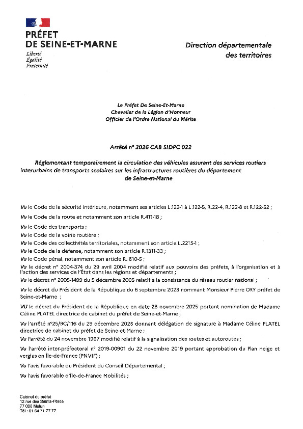En raison des conditions météorologiques, nous vous informons que les transports scolaires seront suspendus pour la journée du mardi 06 janvier 2026 sur l'ensemble du département de la Seine et Marne.