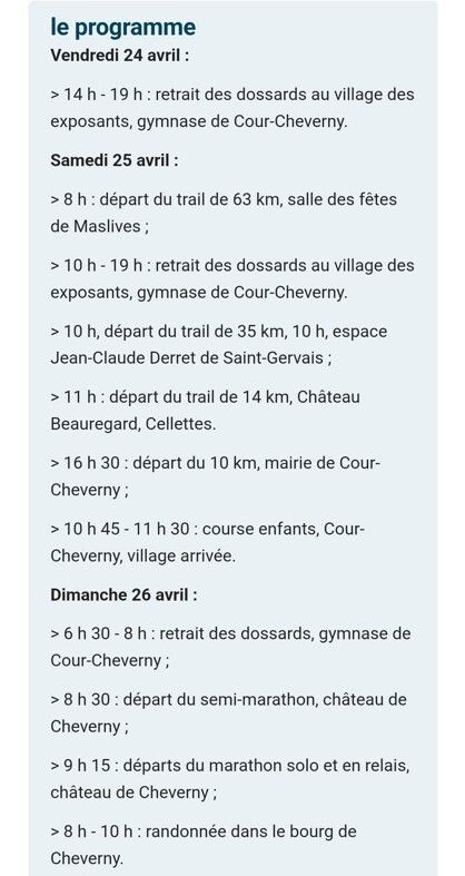 - une course de 10 km (départ 16 h 30 Place de la République à Cour-Cheverny)