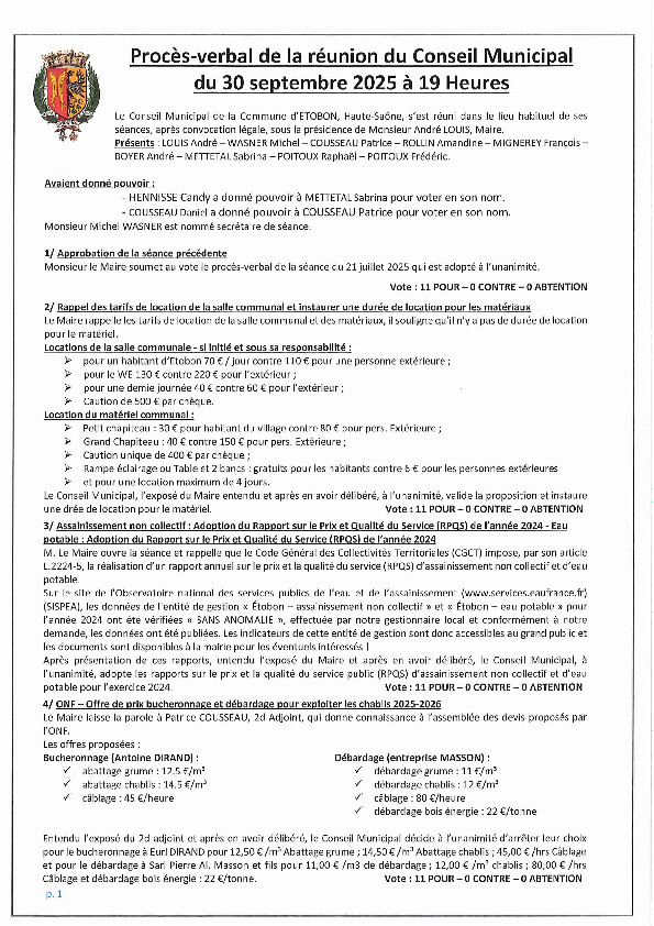 Vous trouverez ci-joint le compte rendu du dernier conseil municipal d'Etobon du 30/09/2025 dernier.