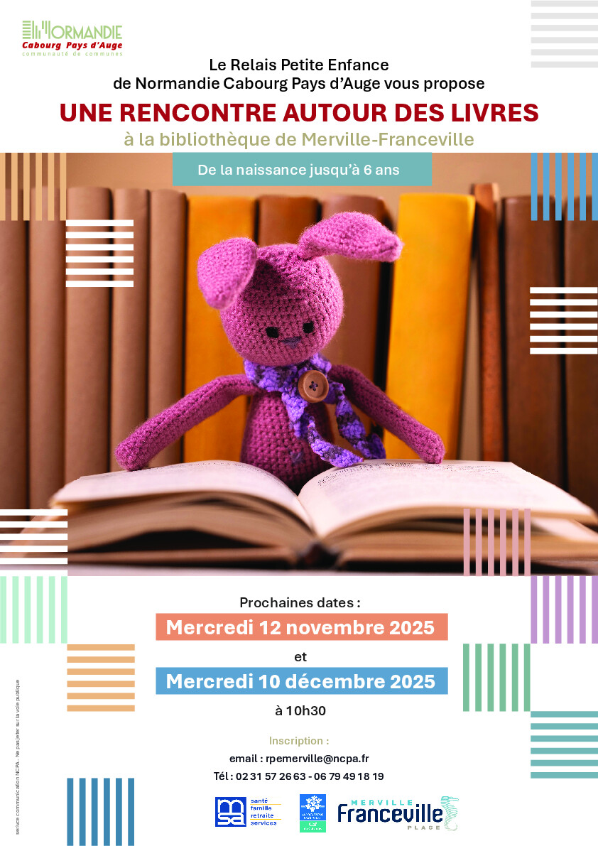 Merville-Franceville : 17/09 – 15/10 – 12/11 – 10/12 à 10h30 à la bibliothèque de Merville-Franceville (inscription : rpemerville@ncpa.fr)