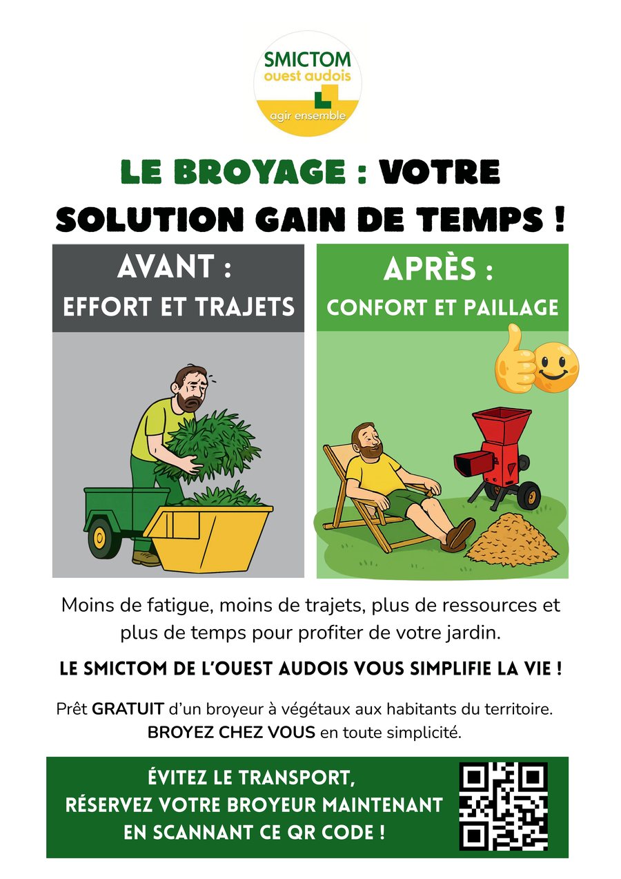 Rappel de la procédure : une formation obligatoire de 45mn environ est dispensée tous les vendredis matin au siège du SMICTOM. Durant les 2 années de validité de cette formation, le broyeur peut être emprunté autant de fois que souhaité.