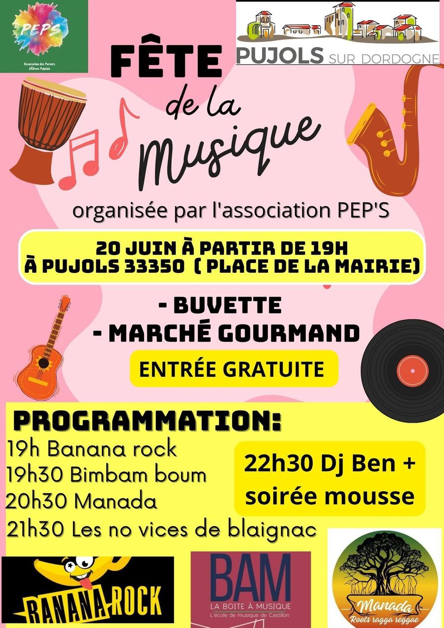 🗓️ À partir de 19h fête de la musique ( 4 groupes+ DJ Ben et soirée mousse) , marché gourmand avec nombreux stands sucrés et salés. 🎸🎵🥁🪇🕺🎤🎹