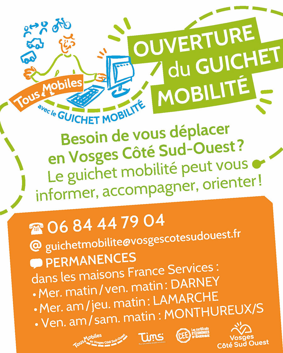 Depuis mercredi 8 octobre, la communauté de communes Les Vosges Côté Sud-Ouest a ouvert le guichet mobilité ! Si vous rencontrez des difficultés dans vos déplacements quotidiens, l’éco-conseiller mobilité Olivier VIRON peut vous renseigner, accompagner et/ou orienter vers une solution adaptée à votre situation. Olivier est joignable par téléphone 06 84 44 79 04 et par mail guichetmobilite@vosgescotesudouest.fr.
