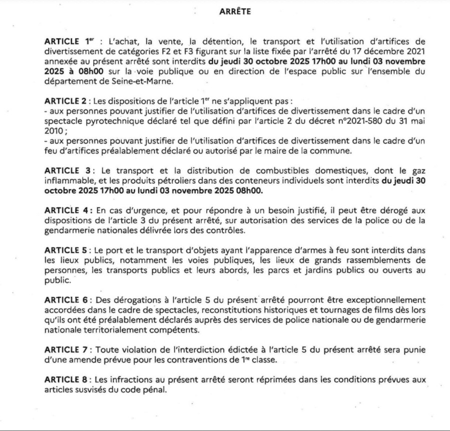 Dans le cadre des festivités d’Halloween, un arrêté préfectoral (n° 2025-CAB-BSIR-1704 du 24/10/2025) réglemente temporairement certaines pratiques sur l’ensemble du département.