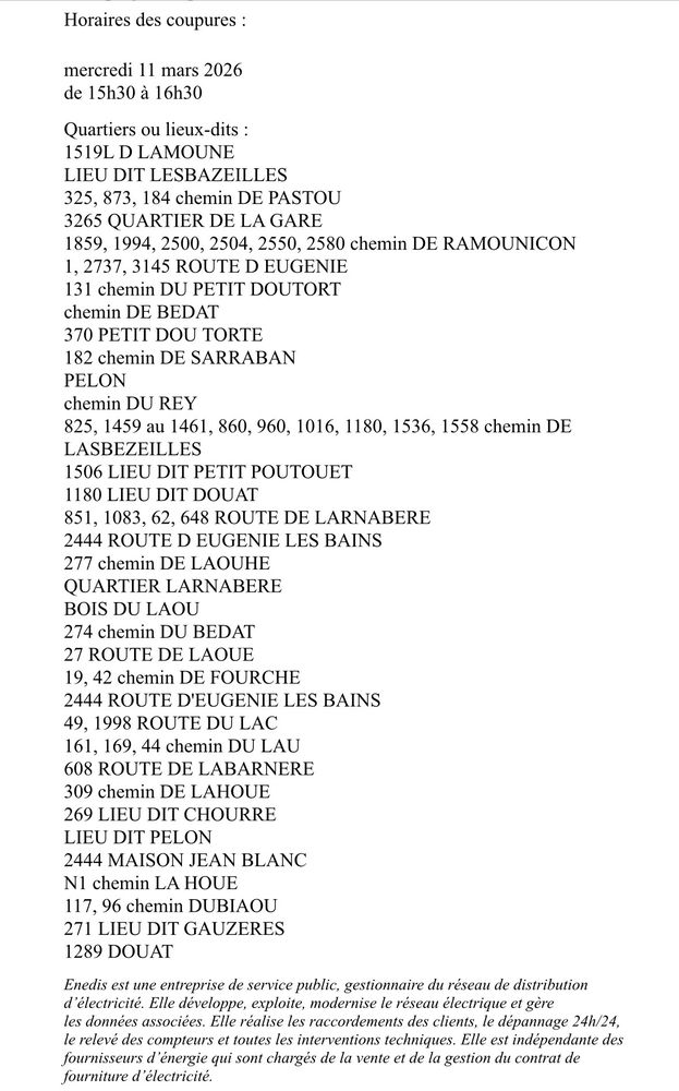 ▫️Intervention prévue HTA mercredi pour les quartiers de la Plaine, du Castera et Bachen