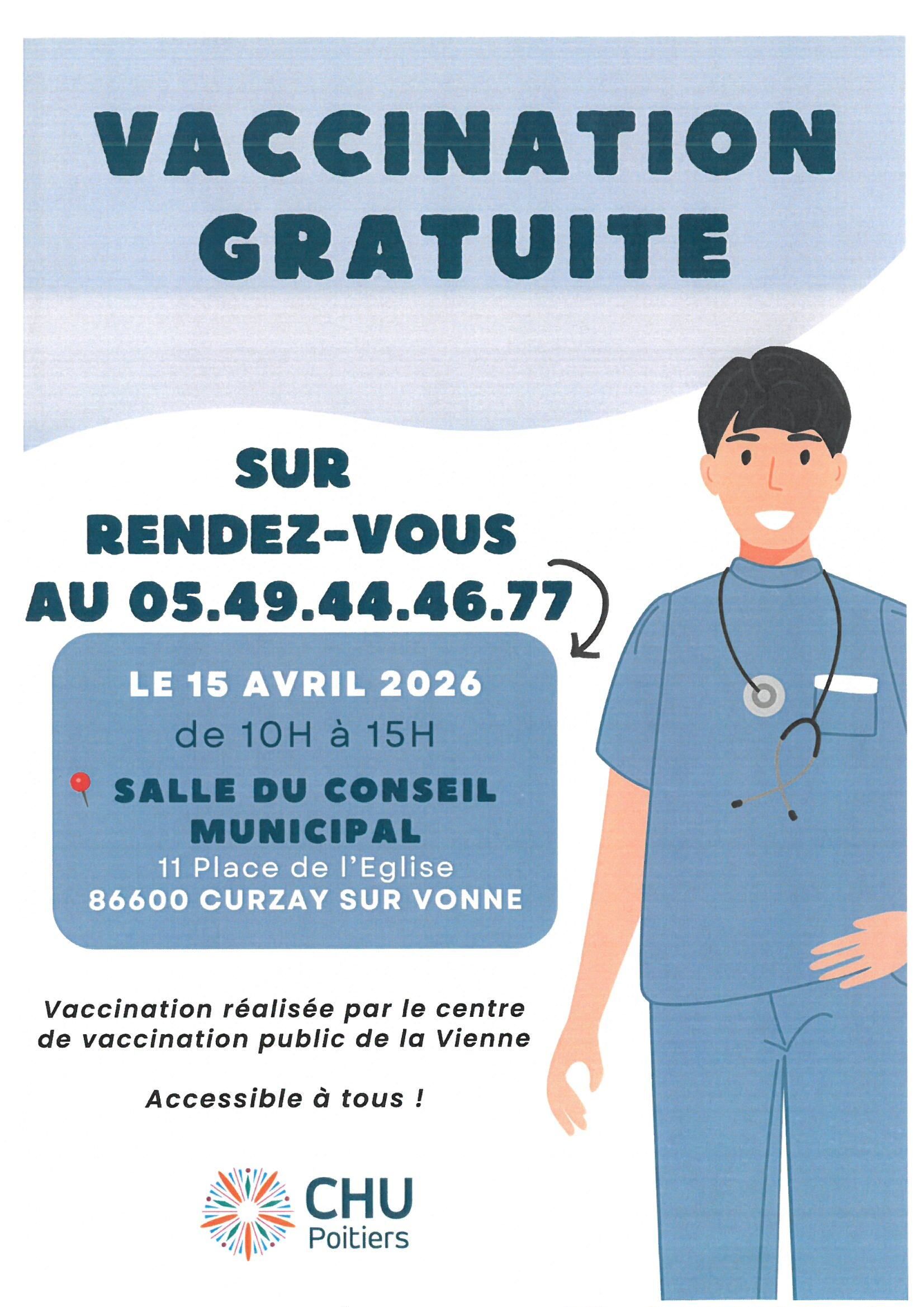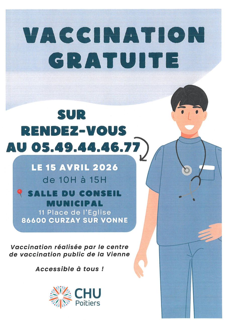 Le centre de vaccination public de la Vienne vous propose à Curzay-sur-Vonne le mercredi 15 avril de 10h à 15h des consultations de vaccination gratuites sur rendez-vous.