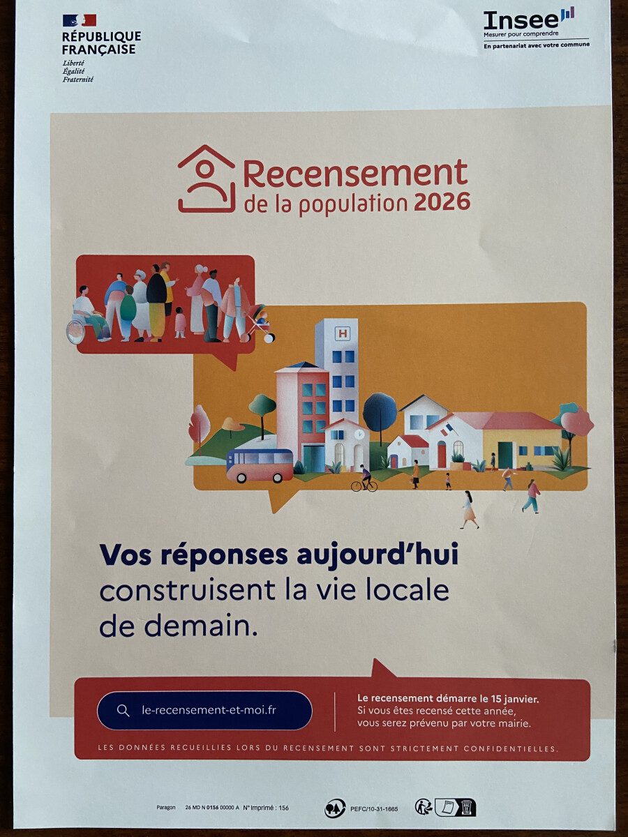 En début d’année 2026, du 15 janvier au 14 février, le recensement de la population va avoir lieu sur notre commune.