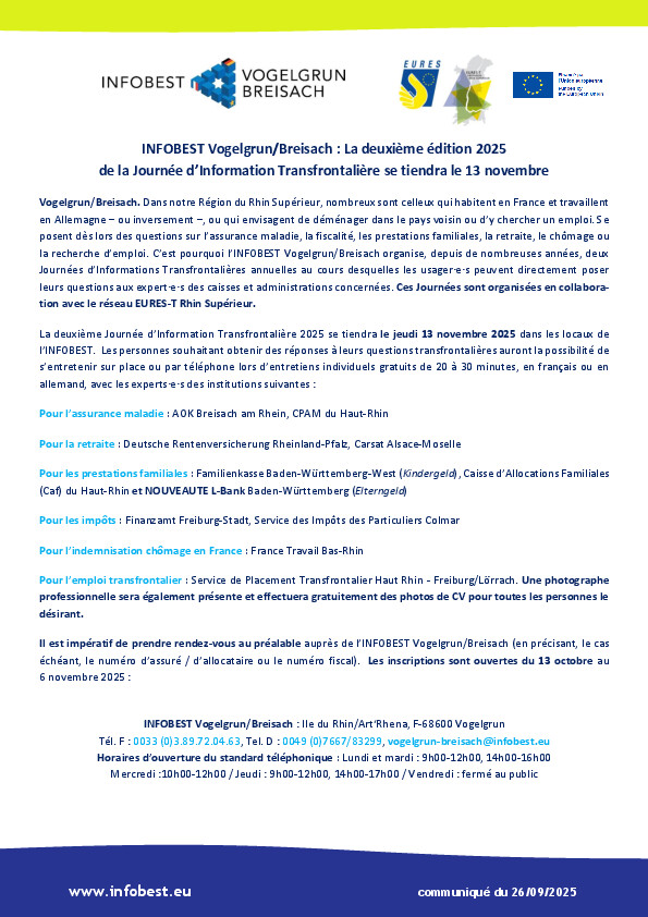 Des permanences sont également tenues tous les mercredis matins des semaines impaires à la Communauté de Communes du Ried de Marckolsheim de 8h30 à 12h00 (sur rendez-vous uniquement).