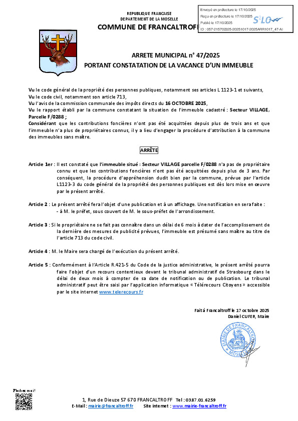 Arrêté municipal n°47/2025 portant constatation de la vacance d'un immeuble : secteur VILLAGE, parcelle F/0288