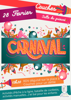 On vous attend nombreux et nombreuses le 28 Février à 15h30 pour un défilé déguisé, place de Couches puis RDV salle du prieuré pour les activités.