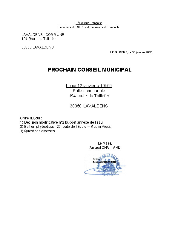 Le prochain conseil municipal est prévu lundi 12 janvier à 10h00 en salle communale