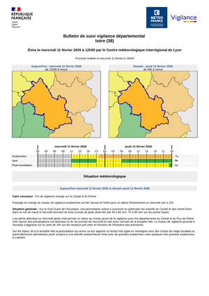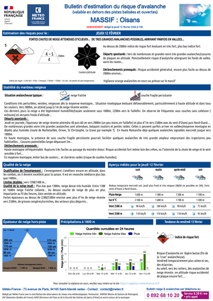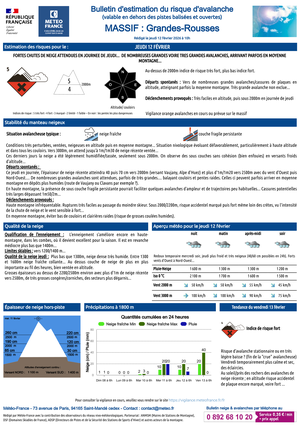 Sur les massifs de l'Oisans et des Grandes Rousses, on attend une activité avalancheuse remarquable. De nombreuses grandes avalanches, de plus en plus volumineuses au fil des chutes de neige de jeudi vont se produire, avec un pic d'activité possible dès ce matin au moment des plus fortes intensités neigeuses puis à nouveau en cours d'après-midi et soirée.