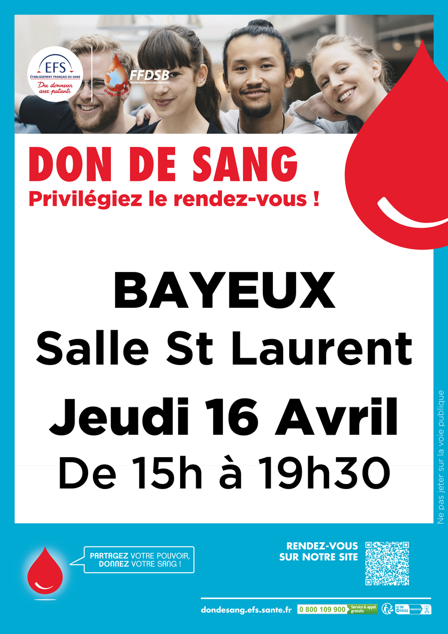 Retrouvez-nous Jeudi 16 Avril de 15h à 19h30 à la Salle Saint Laurent de BAYEUX - Organisez votre venue en vous rendant sur notre site F https://efs.link/CqRos