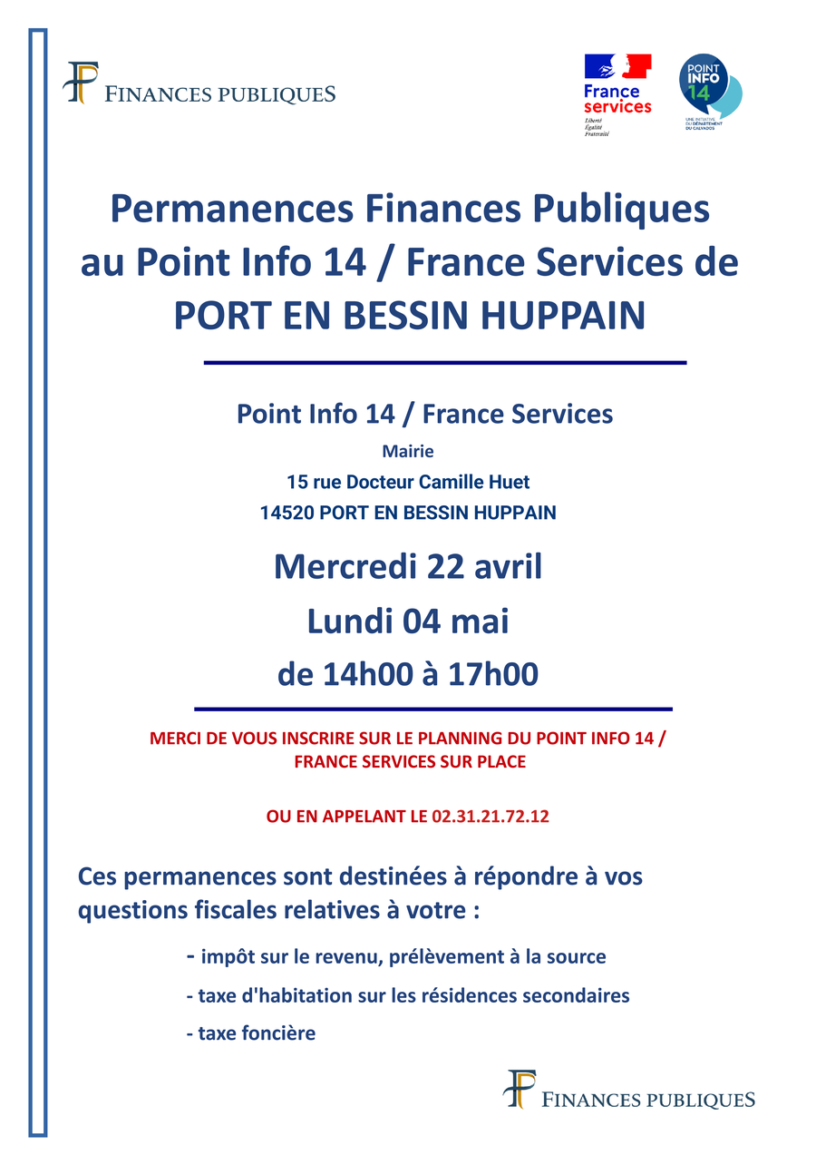 Le centre des finances publiques de Bayeux va tenir deux permanences au Point Info 14/France services de Port en Bessin Huppain (dans les locaux de la mairie) :