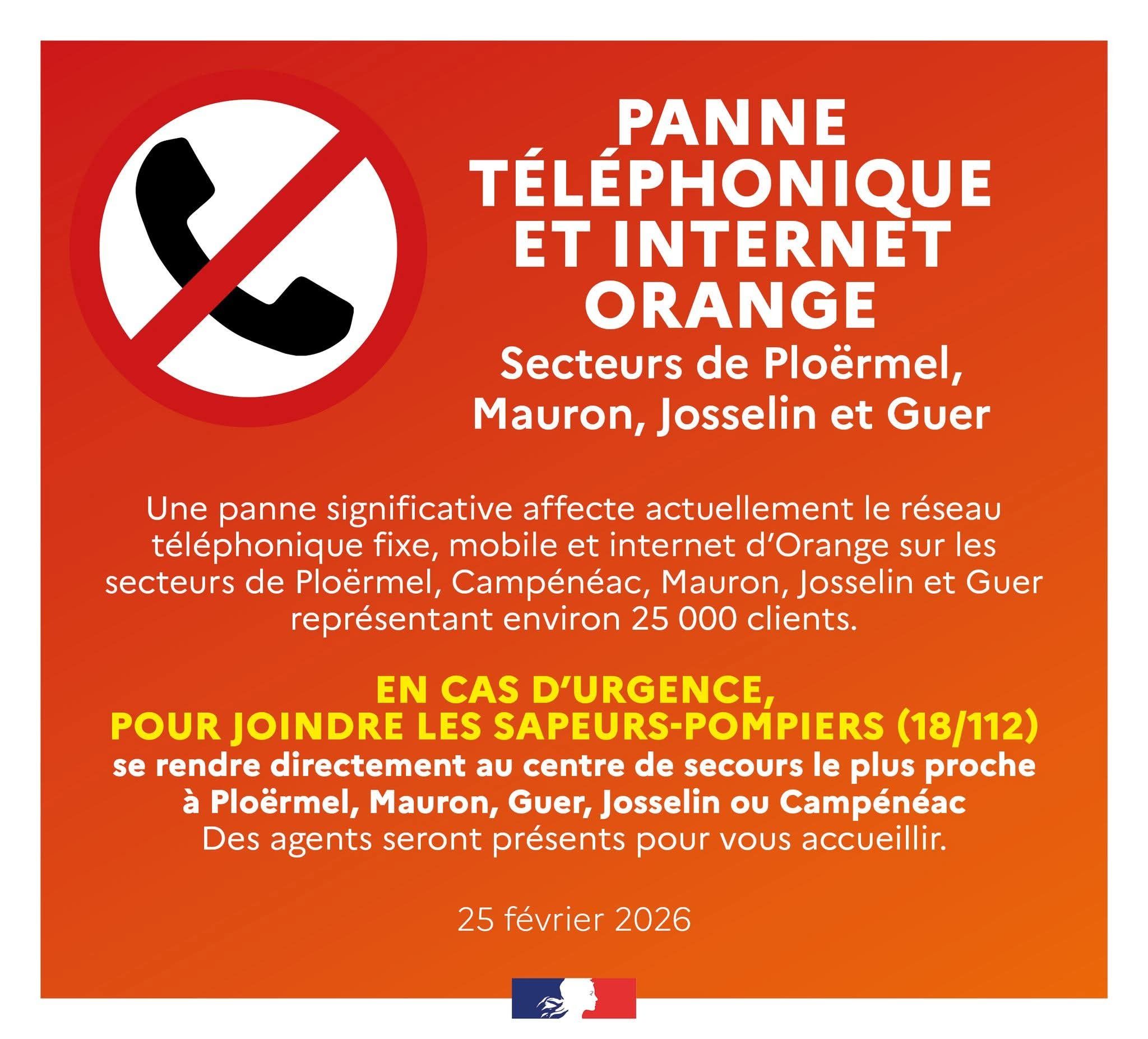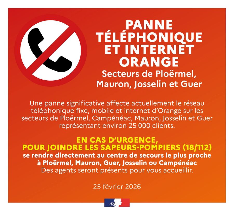Une panne significative affecte actuellement le réseau téléphonique fixe, mobile et internet d’Orange sur les secteurs de Ploërmel, Campénéac, Mauron, Josselin et Guer représentant environ 25 000 clients.