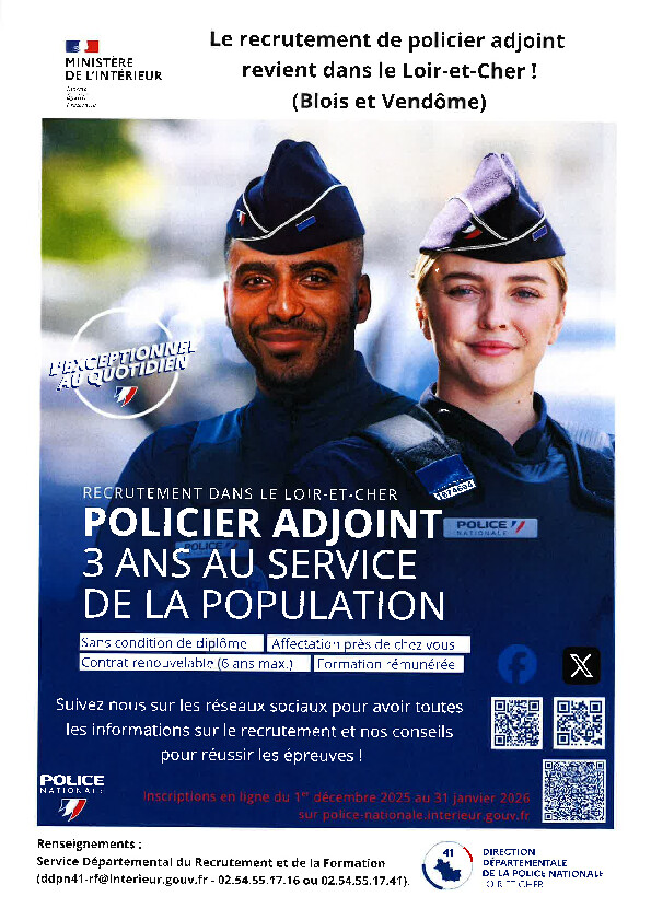 La Police nationale de Loir-et-Cher recrute des jeunes âgés de 17 à 30 ans, sans condition de diplôme, sous réserve de la réussite aux épreuves de sélection. Les inscriptions sont ouvertes du 1ᵉʳ décembre 2025 au 31 janvier 2026 sur le site : www.police-nationale.interieur.gouv.fr