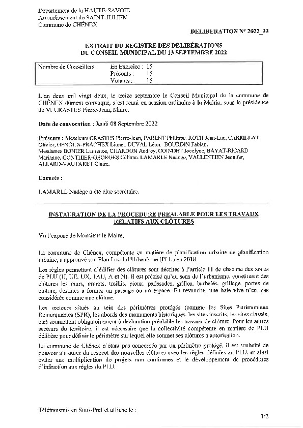 Conformément à la délibération datant de 2022 (copie dessous), toute création ou modification de clôture est soumise à une déclaration préalable de travaux, et ce, de manière systématique sur l’ensemble du territoire communal, conformément aux dispositions du Code de l’urbanisme et du PLU en vigueur.
