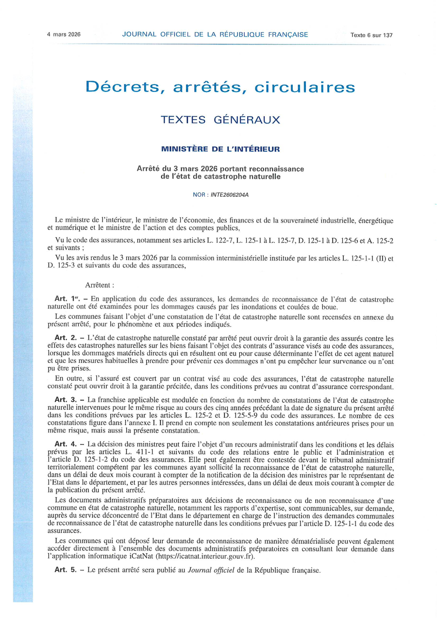 Attention : Les sinistrés disposent d'un délai de 30 jours maximum après publication de l'arrêté interministériel au Journal Officiel du 4 mars 2026 pour faire leur demarche auprès de leur compagnie d'asssurance.