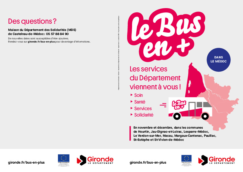 Bus en + : interventions régulières à Saint-Vivien-de-Médoc, Margaux-Cantenac, Macau, etc. (cf. planning du bus pour les détails).