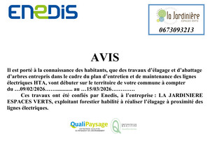 Il est porté à la connaissance des habitants, que des travaux d’élagage et d’abattage d’arbres entrepris dans le cadre du plan d’entretien et de maintenance des lignes électriques HTA, vont débuter sur le territoire