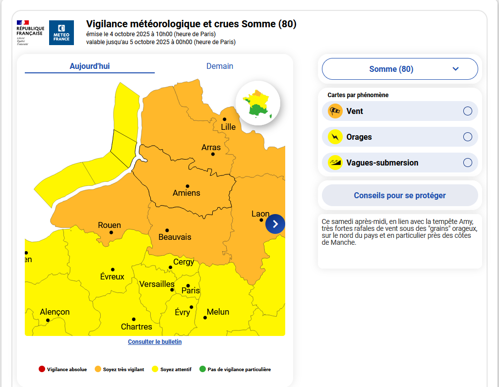Le département de la Somme est placé en vigilance ORANGE ce jour de 12h00 à 00h00 pour VENTS VIOLENTS. Averses orageuses accompagnée de fortes rafales de vent, allant de 90 à 100km/h dans les terres, voire 110 km/h localement. Sur le littoral, les rafales pourront aller de 100 à 120km/h, voire 130 km/h localement. Il est recommandé d'annuler les activités et rassemblements en extérieur, avec une vigilance particulière sur les chapiteaux, tentes et structures.