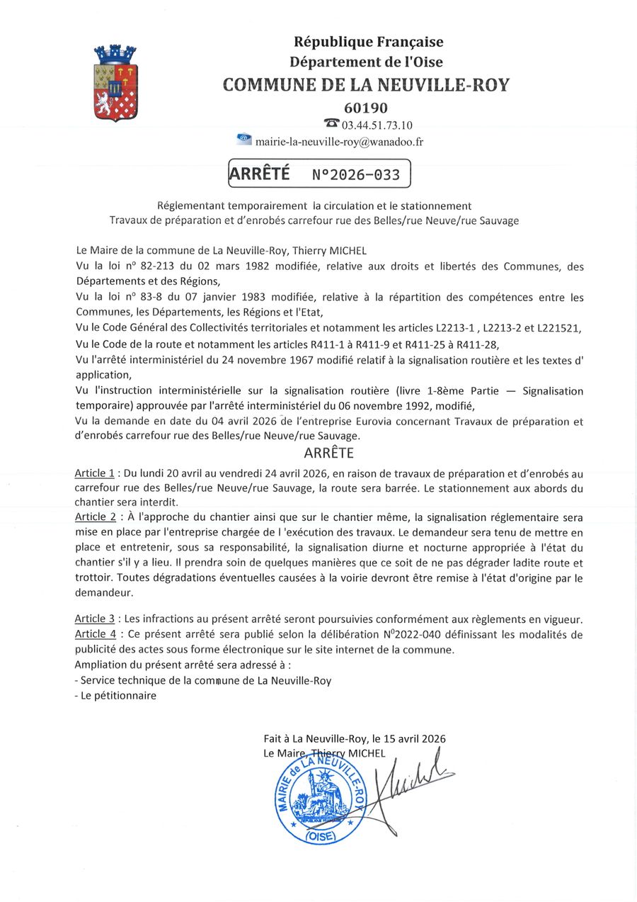 - arrêté communal travaux prévus le lundi 20 avril 2026