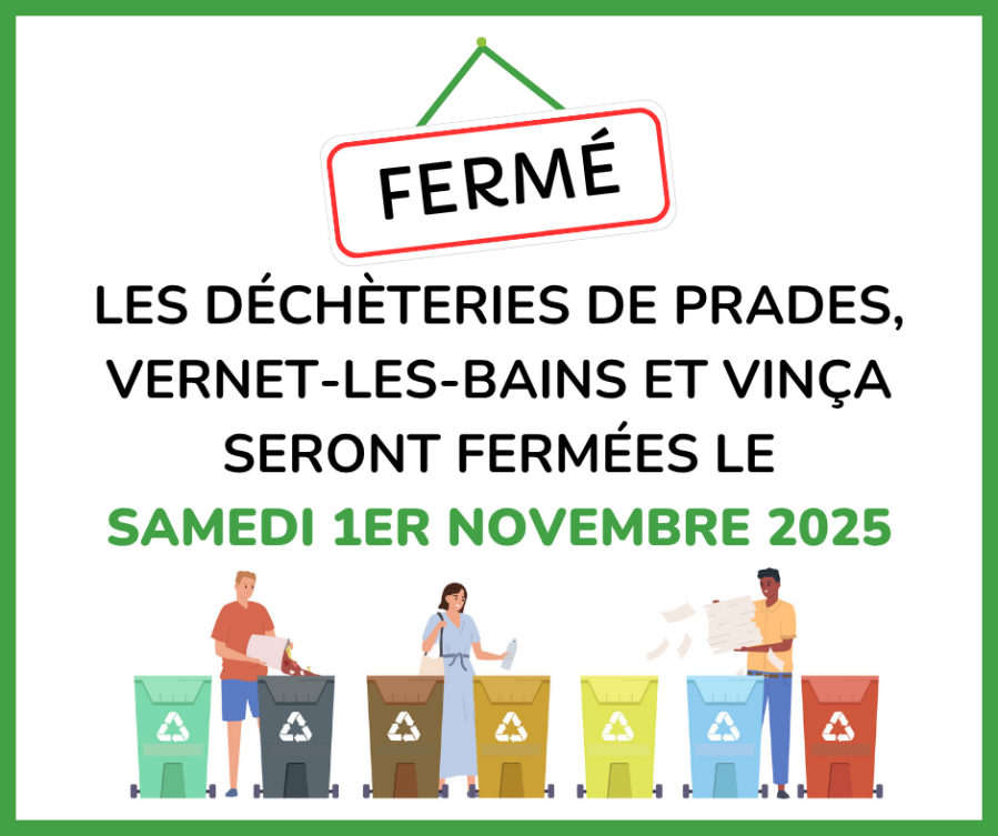 Demain samedi, les déchèteries intercommunales de Prades, Vernet-les-Bains et Vinça seront fermées comme lors de chaque jour férié. Nos agents vous accueilleront dès le dimanche 2 novembre à partir de 9h00 à Prades et à partir du mardi 4 novembre à 9h00 à Vernet-les-Bains et Vinça pour recueillir vos gravats et autres déchets de la veille.