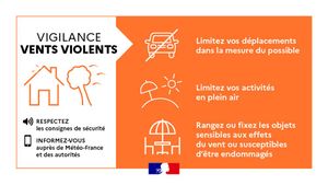 • Limiter strictement ses déplacements, en particulier à proximité des cours d’eau et dans les secteurs susceptibles d’être impactés par les crues ou les fortes rafales de vent.