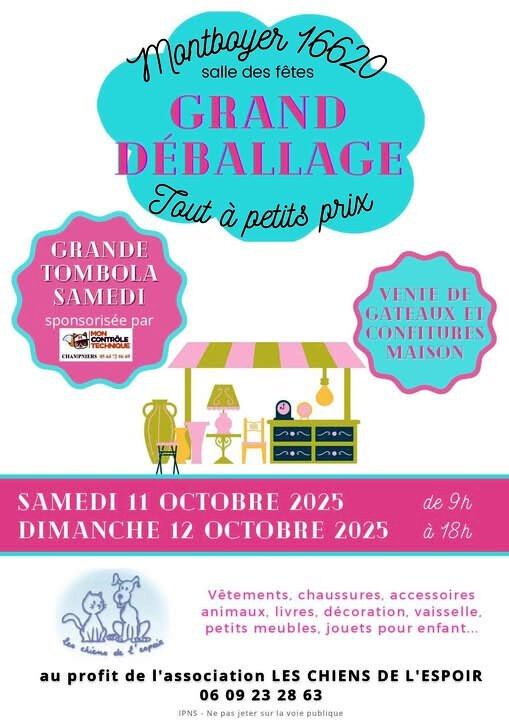 L'association Les Chiens de l'Espoir organise son grand VIDE MAISON à la salle des fêtes de MONTBOYER (16620) les samedi 11 et dimanche 12 Octobre 2025 de 9h à 18h.