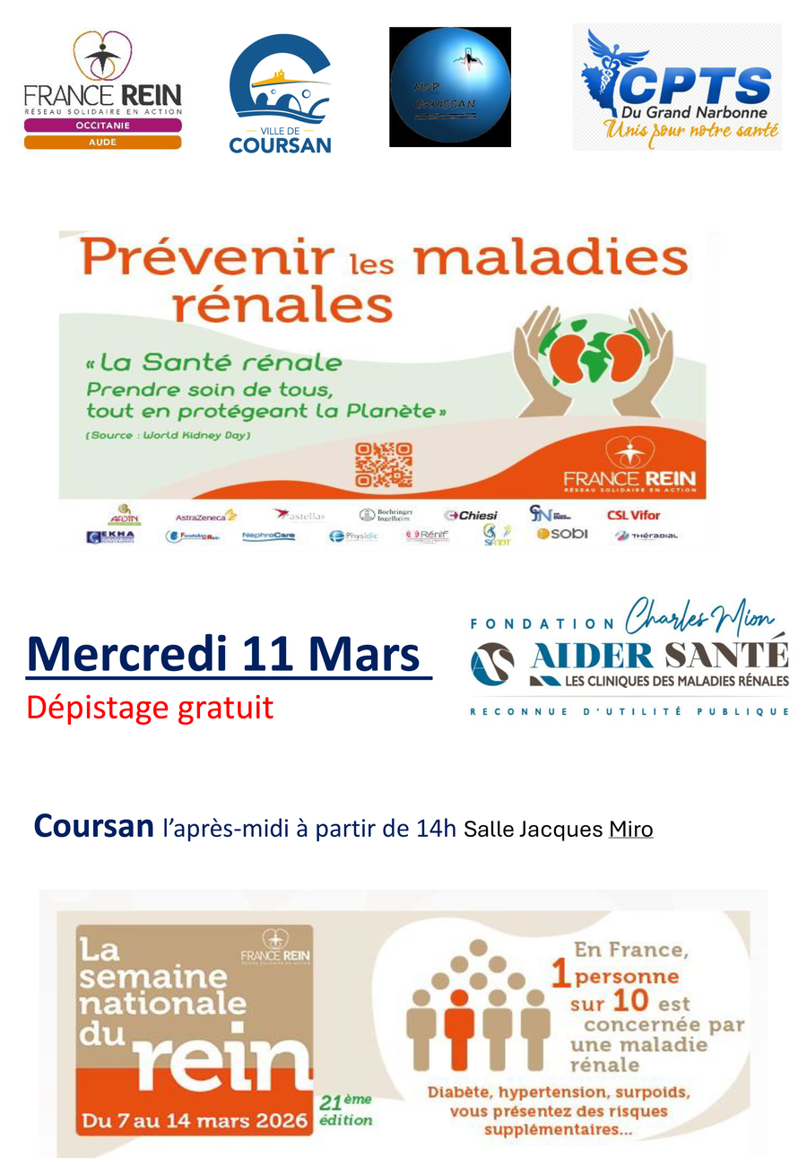 Dans le cadre des Semaines nationales du rein, la CPTS du Grand Narbonne, en partenariat avec l’association France Rein propose une après-midi de dépistage gratuit des maladies rénales au grand public :