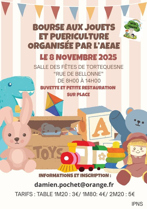 L'Association des Anciens Elèves et Amis de l'Ecole (A.E.A.E.) organise sa bourse aux jouets et puériculture le samedi 8 novembre de 8h à 14h.