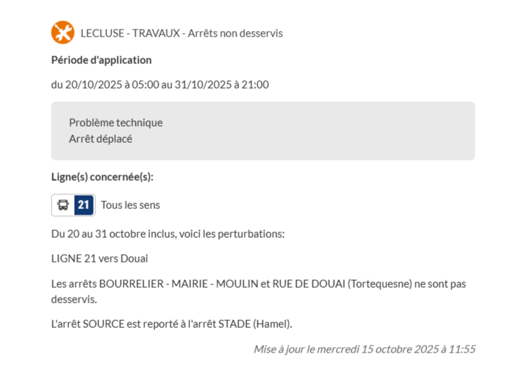 EVEOLE nous informe que suite aux travaux de réfection de la rue de Lécluse réalisés sur la commune de Lécluse, l'arrêt rue de Douai de la ligne 21 ne sera pas desservis pendant la durée du chantier.