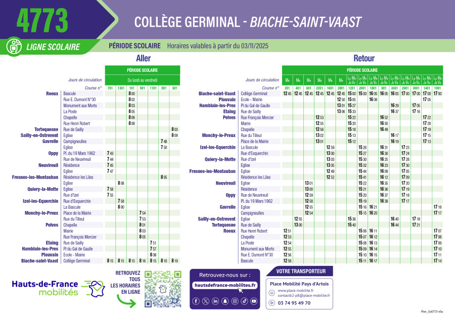 Suite à des modifications horaires concernant la ligne régionale 4773 du réseau d’autocars Hauts-de-France mobilités - Périmètre 8 Arras Nord Est, vous trouverez ci-dessous la nouvelle fiche horaire valable à partir de lundi 3 novembre 2025.