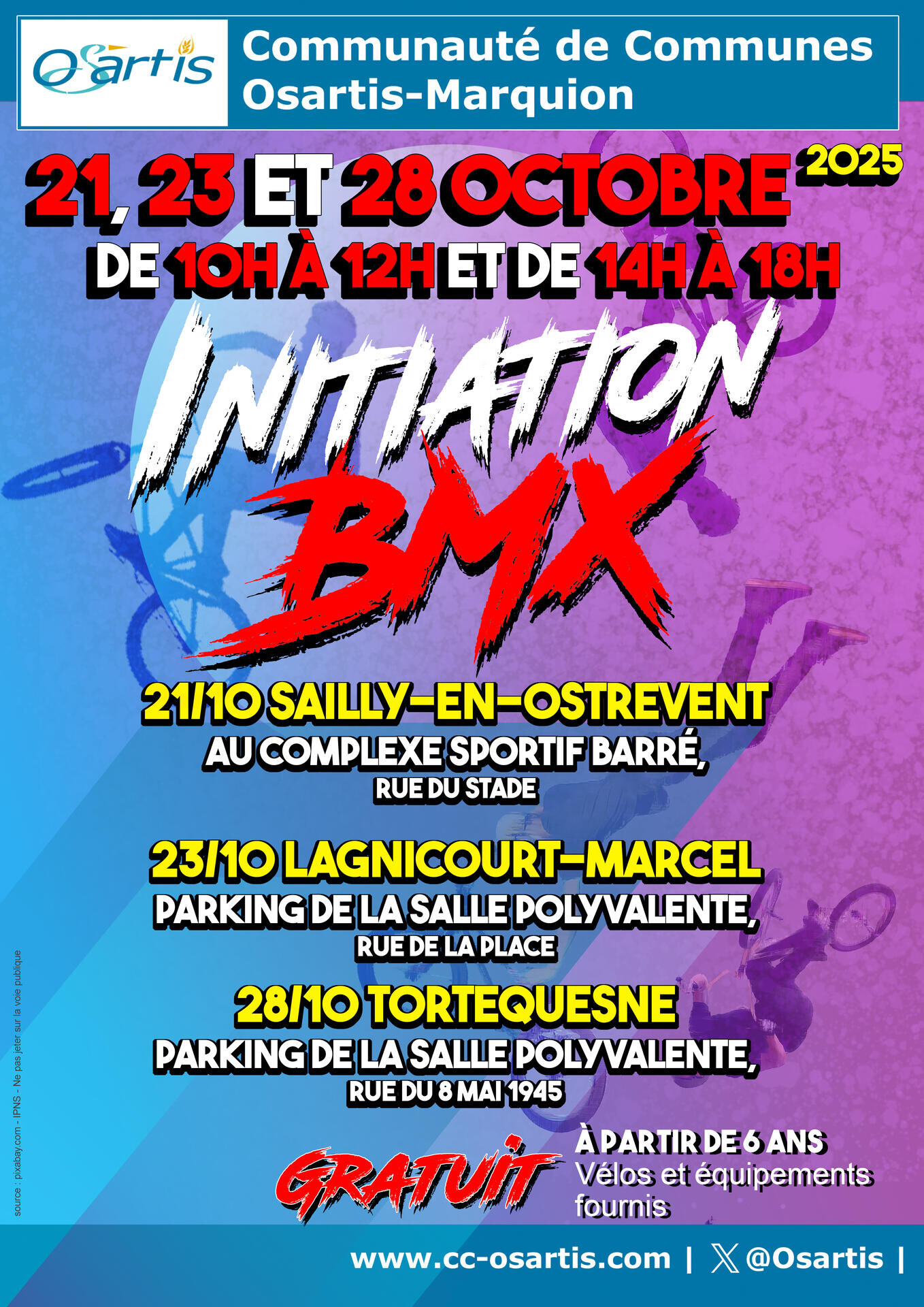 Pendant les vacances scolaires d’octobre 2025, la Communauté de Communes propose 3 dates d’initiation au BMX, sur 3 communes du territoire : Lagnicourt-Marcel, Sailly-en-Ostrevent et TORTEQUESNE.