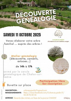 SAMEDI 11 OCTOBRE à 14h (jusqu'à 17h) : venez découvrir ce qu'est un arbre généalogique et commencer à créer le vôtre au milieu des arbres :-). Animé par le cercle de généalogie de Chalon.