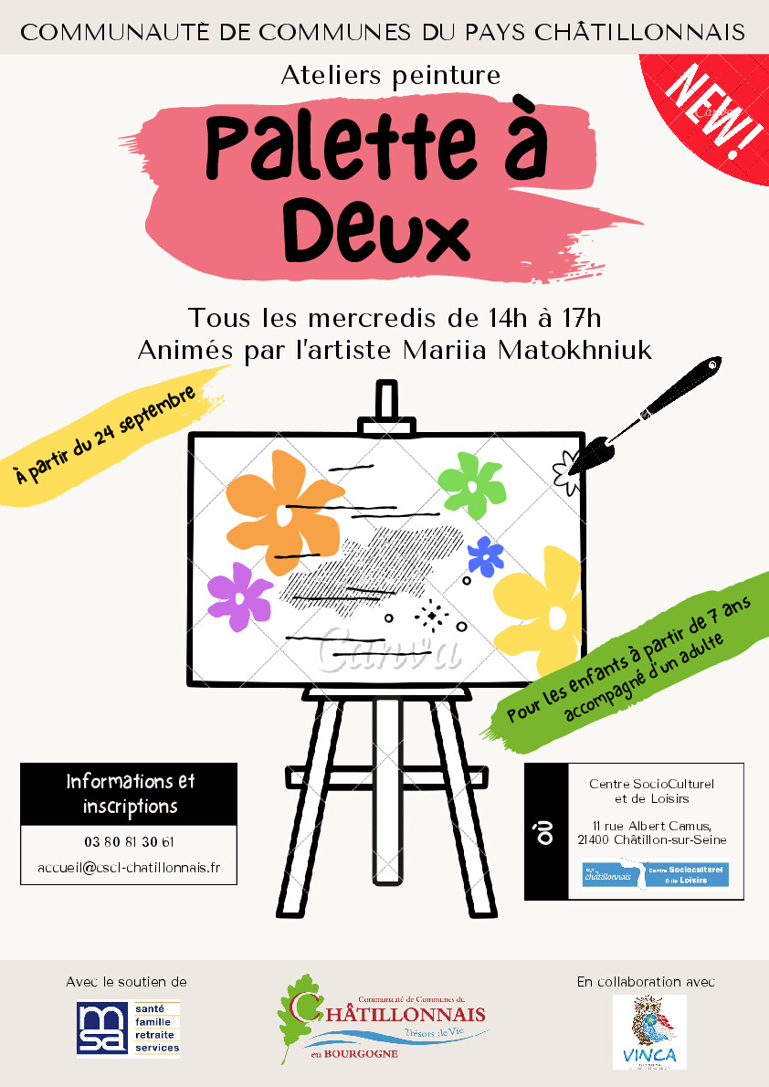 "Palette à deux", un rendez-vous duo de sensibilisation artistique adultes-enfants proposé par Mariia à compter du mercredi 24 septembre prochain au Centre SocioCulturel et de Loisirs de la Communauté de Communes du Pays Châtillonnais.