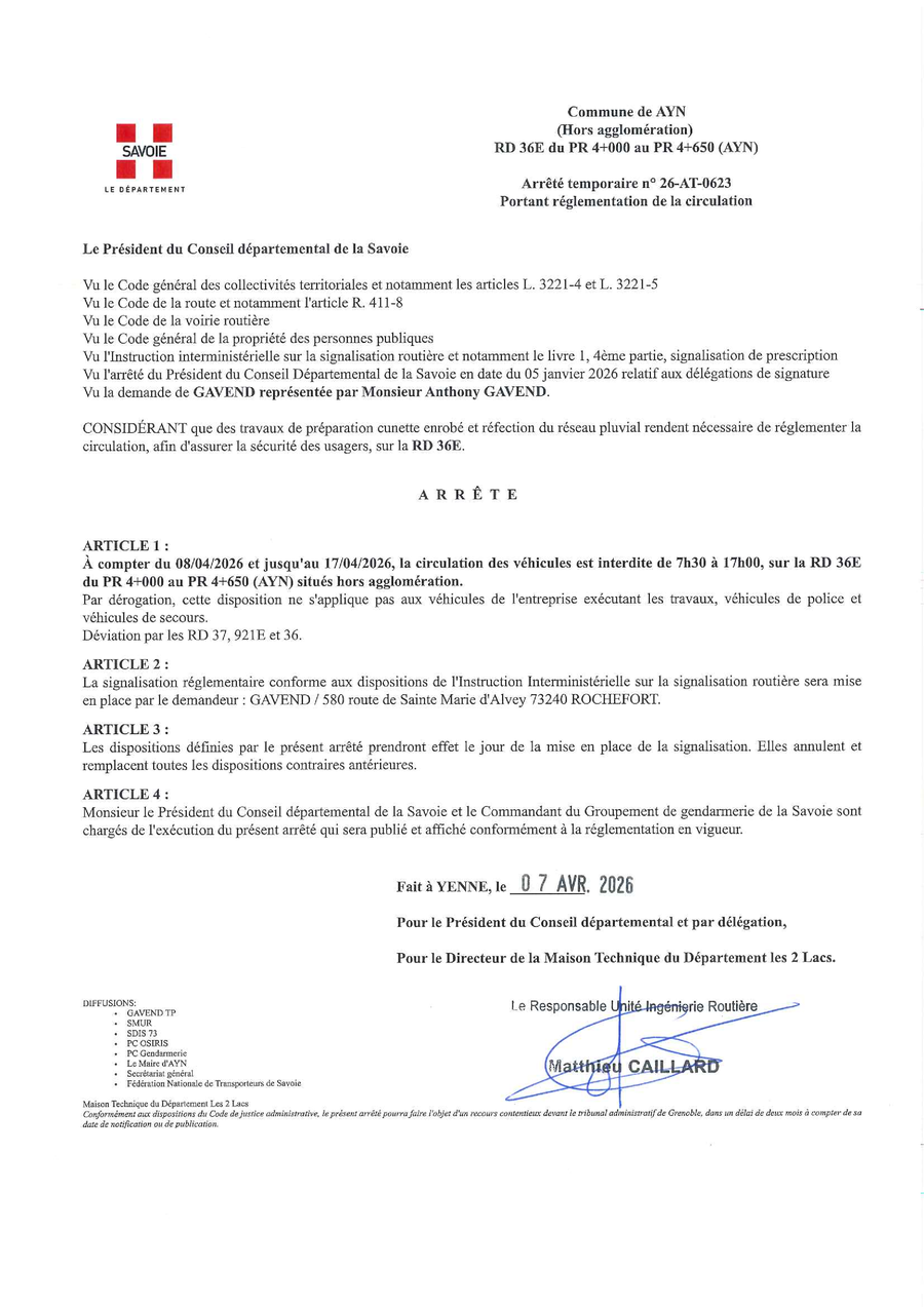 En raison de travaux réalisés sur la RD36E, la route de Lépin-le-Lac sera fermée