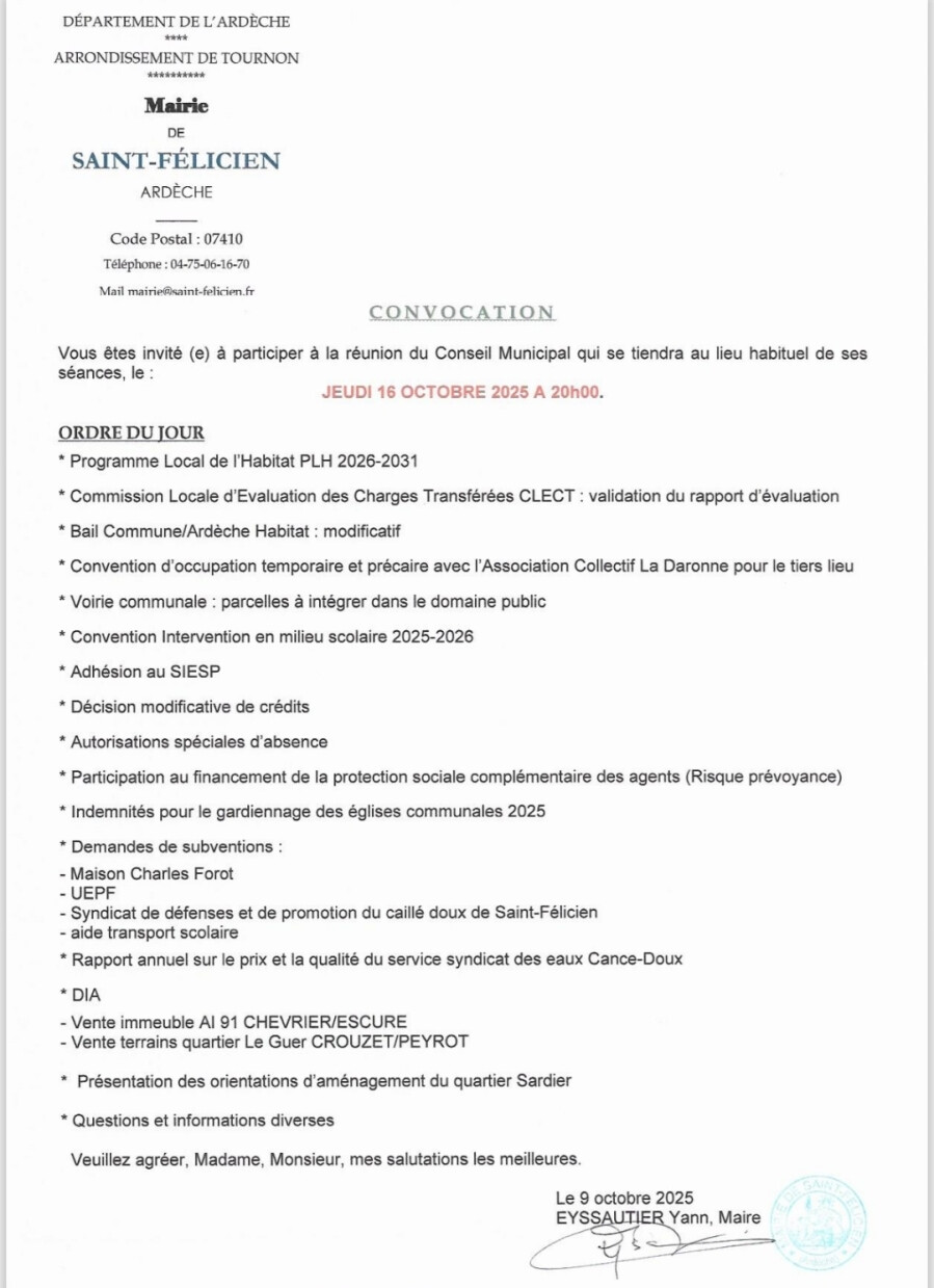 S’adresser à la mairie : 0475061670 ou mairie@saint-felicien.fr