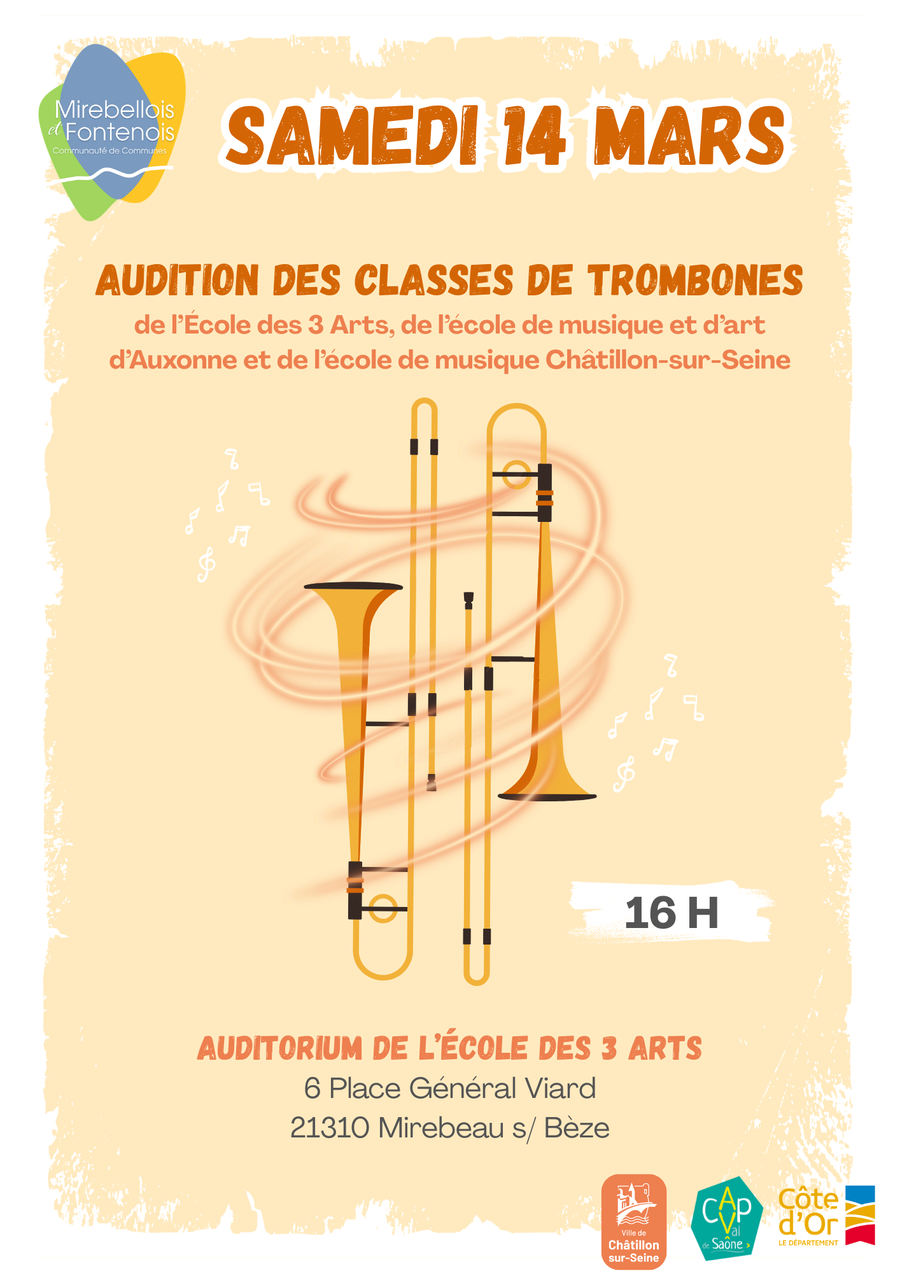 Samedi 14 mars : Audition des classes de trombones de l’École des 3 Arts, de l’école de musique et d’art d’Auxonne e de l’école de musique de Châtillon-sur-Seine