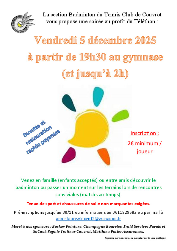 La section Badminton du Tennis Club de Couvrot vous propose une grande soirée au profit du Téléthon