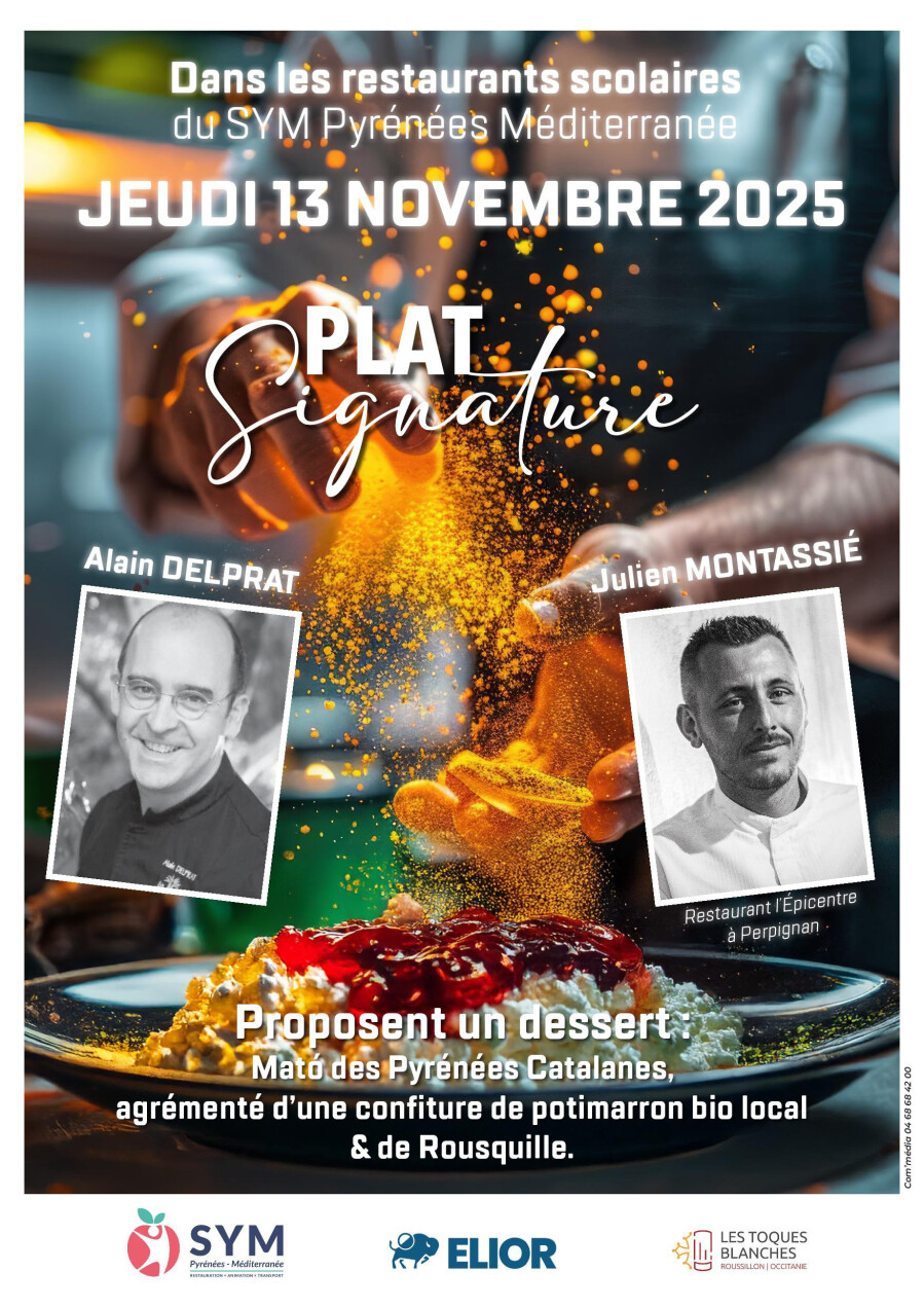 Dans le cadre de sa mission d'éducation à l'alimentation et afin de promouvoir les produits du Roussillon servis dans les assiettes de nos écoliers, le SYM Pyrénées Méditerranée et son prestataire Elior ont créé le PLAT SIGNATURE.