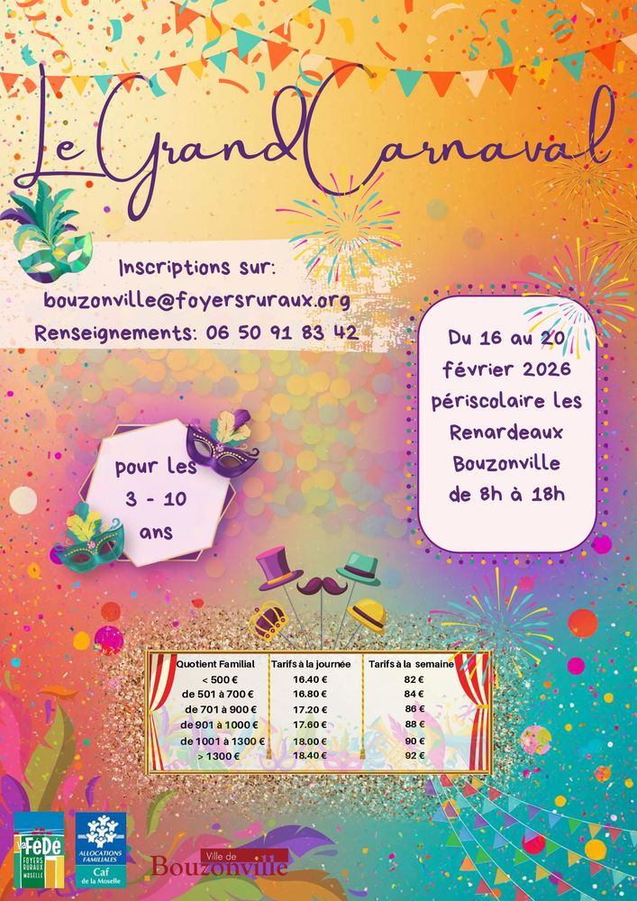 La Fédération Départementale des Foyers Ruraux de Moselle et la Ville de Bouzonville organisent un centre aéré sur le thème "Le Grand Carnaval" 🦹 :